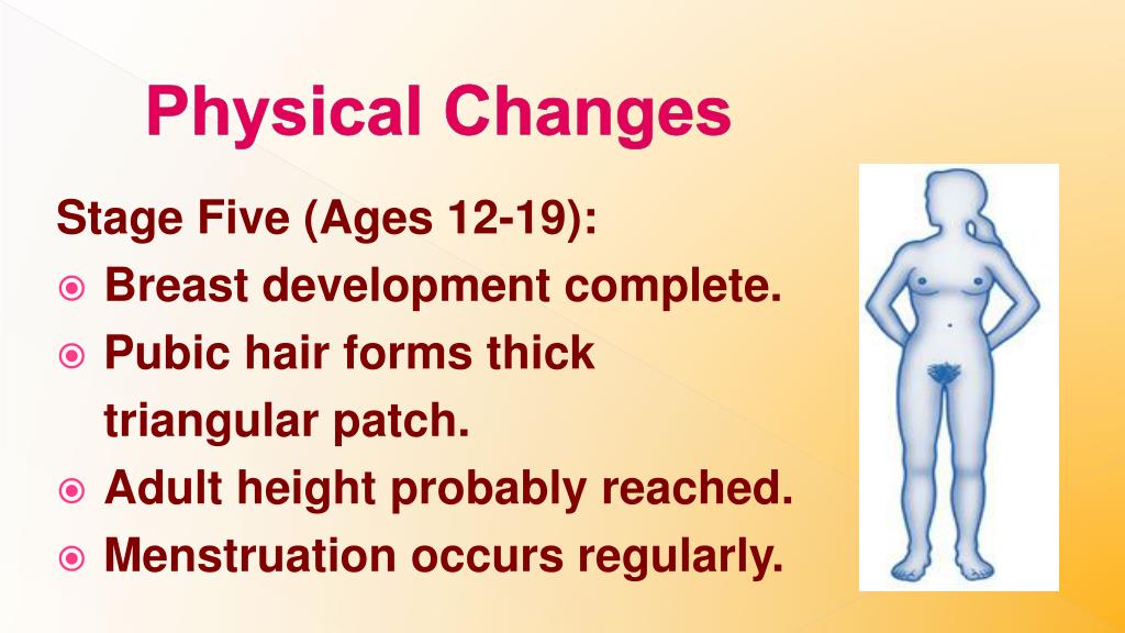 Physical Changes Stage Five (Ages 12-19): • Breast development complete. • Pubic hair forms thick triangular patch. • Adult height probably reached. • Menstruation occurs regularly.