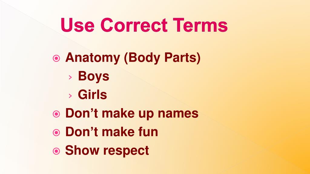 Use Correct Terms • Anatomy (Body Parts) • Boys • Girls • Don’t make up names • Don’t make fun • Show respect