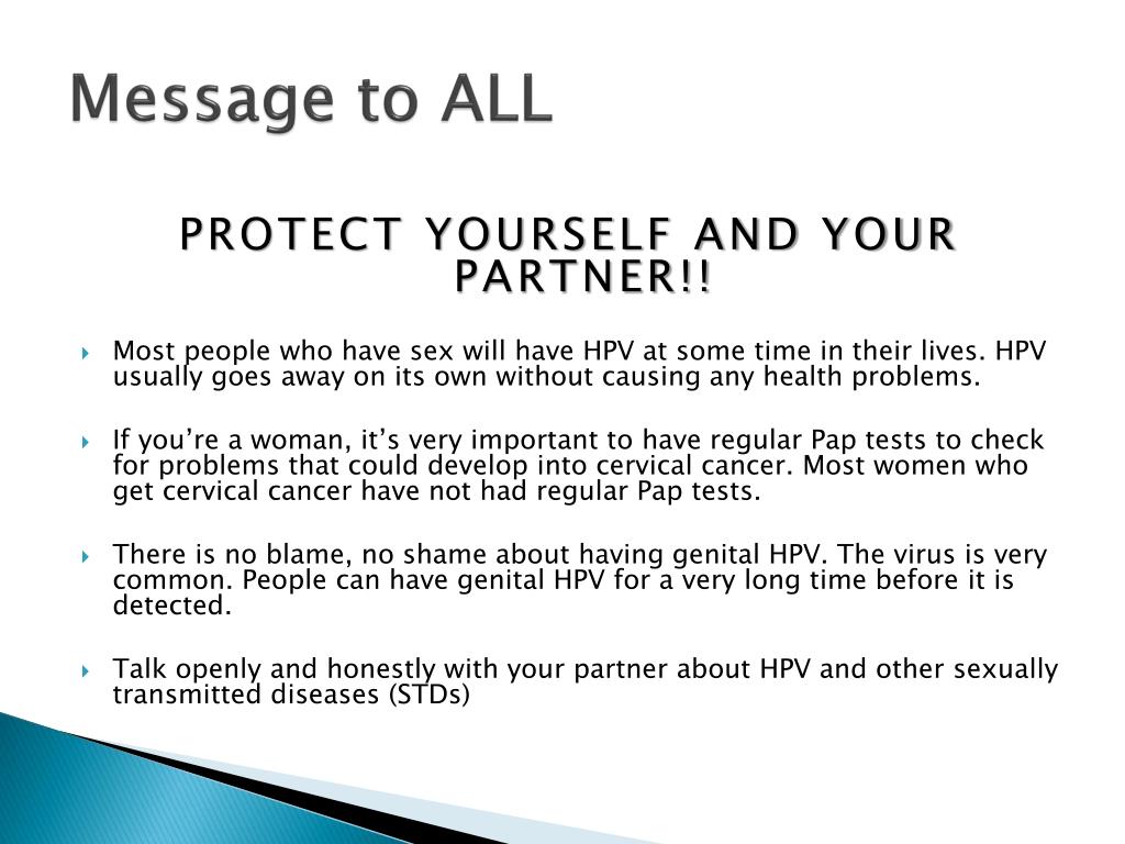 Message to ALL PROTECT YOURSELF AND YOUR PARTNER!! • Most people who have sex will have HPV at some time in their lives. HPV usually goes away on its own without causing any health problems. • If you’re a woman, it’s very important to have regular Pap tests to check for problems that could develop into cervical cancer. Most women who get cervical cancer have not had regular Pap tests. • There is no blame, no shame about having genital HPV. The virus is very common. People can have genital HPV for a very long time before it is detected. • Talk openly and honestly with your partner about HPV and other sexually transmitted diseases (STDs)