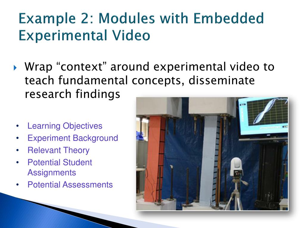Wrap “context” around experimental video to teach fundamental concepts, disseminate research findings Example 2: Modules with Embedded Experimental Video • Learning Objectives • Experiment Background • Relevant Theory • Potential Student Assignments • Potential Assessments