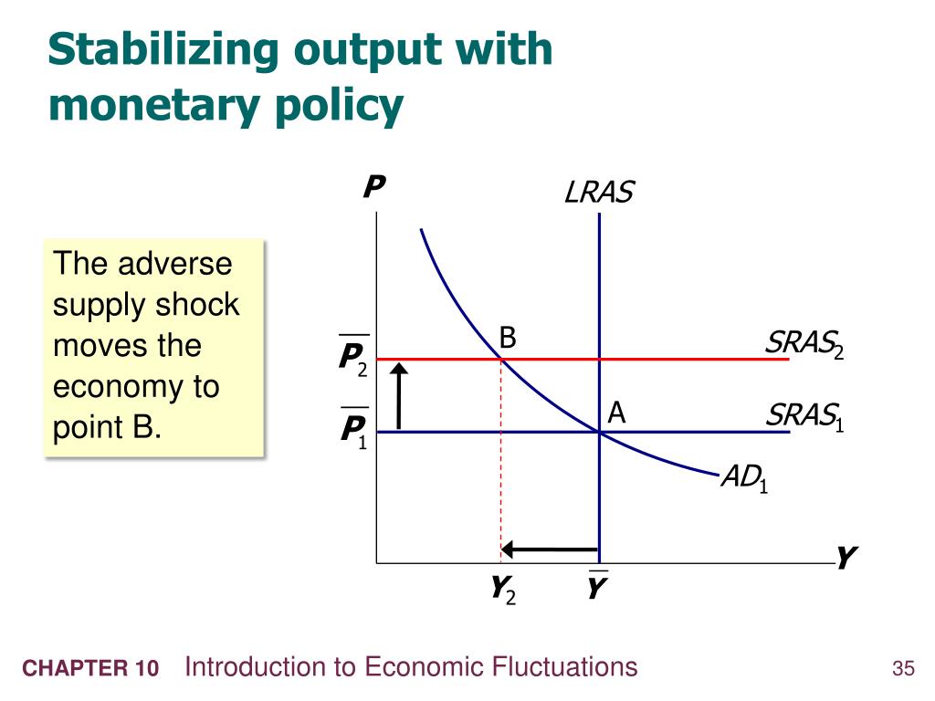 Stabilization policy • def: policy actions aimed at reducing the severity of short-run economic fluctuations. • Example: Using monetary policy to combat the effects of adverse supply shocks…