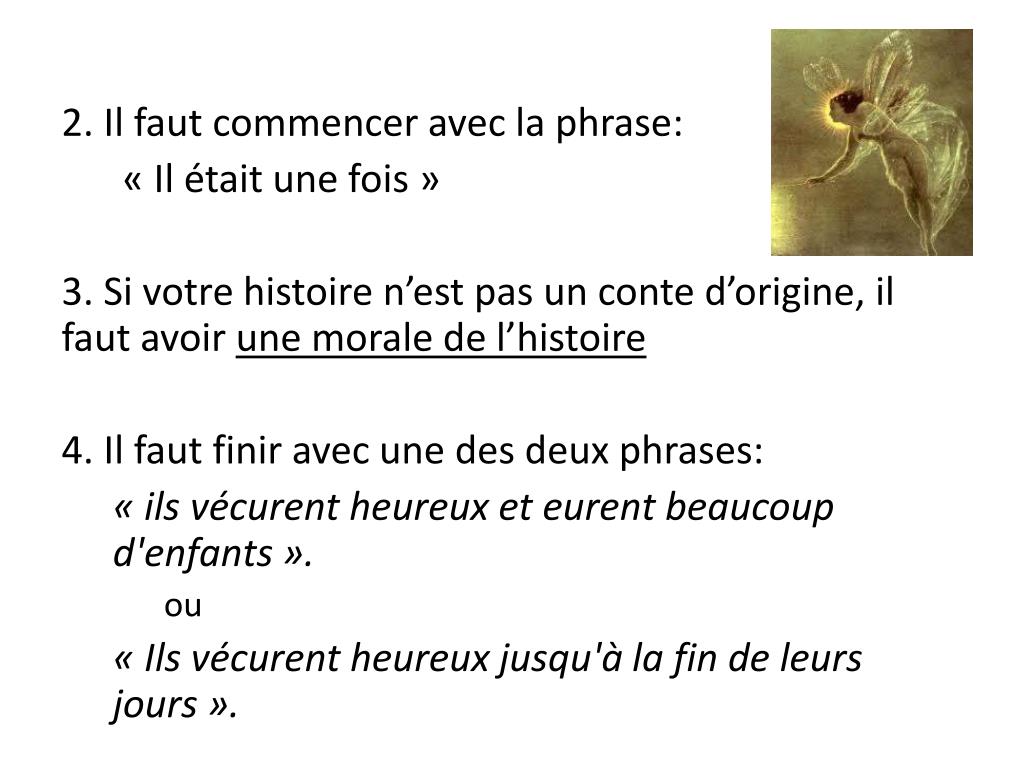 2. Il faut commencer avec la phrase: « Il était une fois » 3. Si votre histoire n’est pas un conte d’origine, il faut avoir une morale de l’histoire 4. Il faut finir avec une des deux phrases: « ils vécurent heureux et eurent beaucoup d'enfants ». ou « Ils vécurent heureux jusqu'à la fin de leurs jours ».