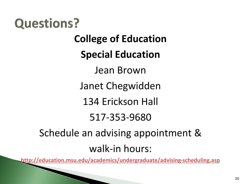 Questions? College of Education Special Education Jean Brown Janet Chegwidden 134 Erickson Hall 517-353-9680 Schedule an advising appointment & walk-in hours: http://education.msu.edu/academics/undergraduate/advising-scheduling.asp