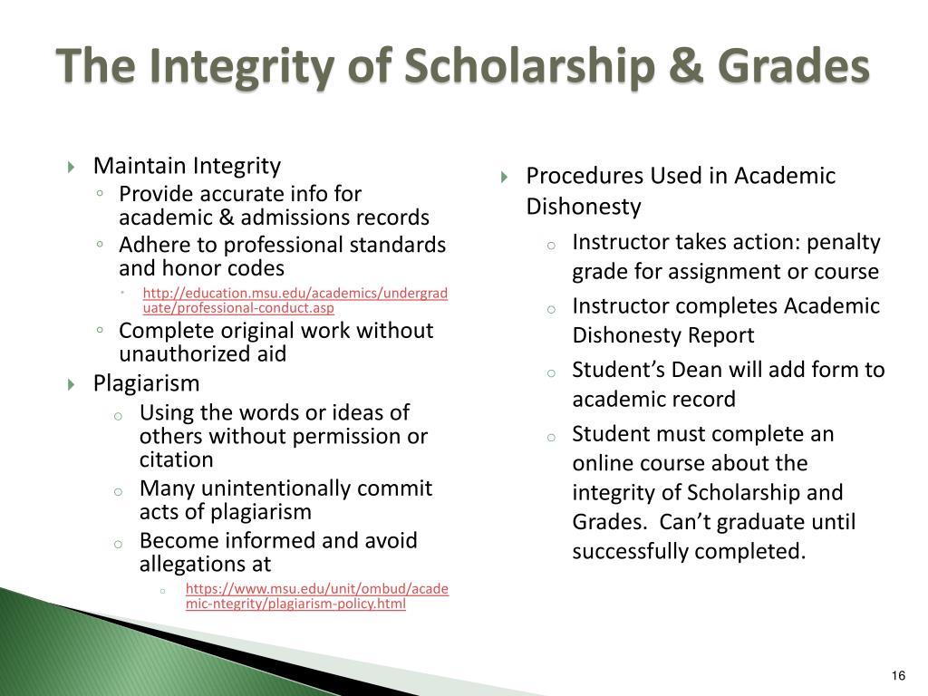 The Integrity of Scholarship & Grades • Maintain Integrity • Provide accurate info for academic & admissions records • Adhere to professional standards and honor codes • http://education.msu.edu/academics/undergraduate/professional-conduct.asp • Complete original work without unauthorized aid • Plagiarism • Using the words or ideas of others without permission or citation • Many unintentionally commit acts of plagiarism • Become informed and avoid allegations at • https://www.msu.edu/unit/ombud/academic-ntegrity/plagiarism-policy.html • Procedures Used in Academic Dishonesty • Instructor takes action: penalty grade for assignment or course • Instructor completes Academic Dishonesty Report • Student’s Dean will add form to academic record • Student must complete an online course about the integrity of Scholarship and Grades. Can’t graduate until successfully completed.