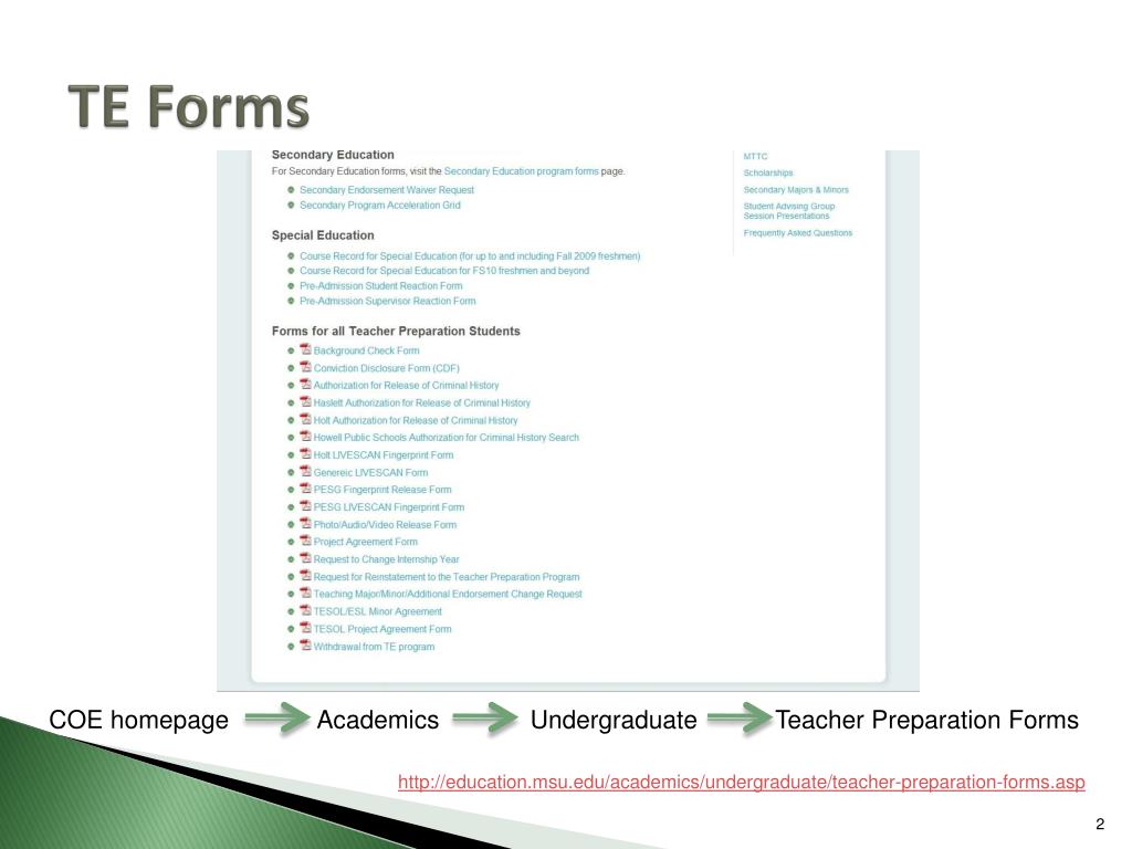 TE Forms COE homepage Academics Undergraduate Teacher Preparation Forms http://education.msu.edu/academics/undergraduate/teacher-preparation-forms.asp