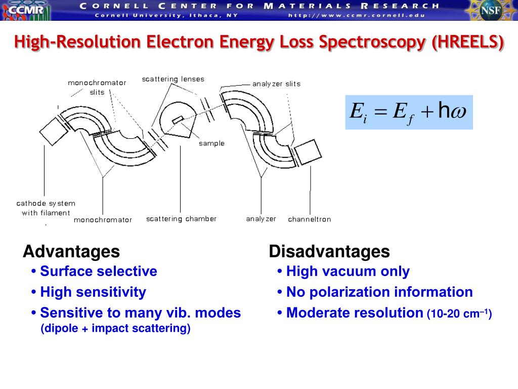 Surface Vibrational Spectroscopy Prof. Melissa A. Hines Dept. of Chemistry. High-Resolution Electron Energy Loss Spectroscopy (HREELS). Advantages. Disadvantages. • Surface selective • High sensitivity • Sensitive to many vib. modes (dipole + impact scattering). • High vacuum only