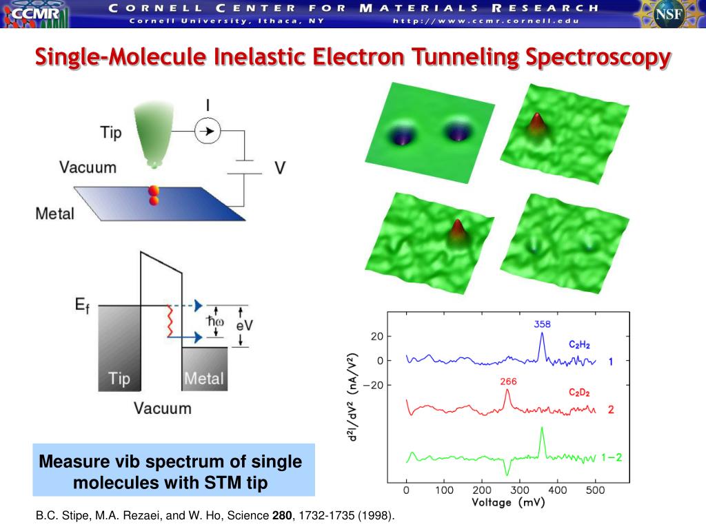 Single-Molecule Inelastic Electron Tunneling Spectroscopy Measure vib spectrum of single molecules with STM tip B.C. Stipe, M.A. Rezaei, and W. Ho, Science 280, 1732-1735 (1998).