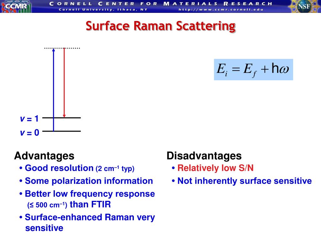 Surface Raman Scattering v = 1 v = 0 Advantages Disadvantages • Good resolution (2 cm–1 typ) • Some polarization information • Better low frequency response (≤ 500 cm–1) than FTIR • Surface-enhanced Raman very sensitive • Relatively low S/N • Not inherently surface sensitive