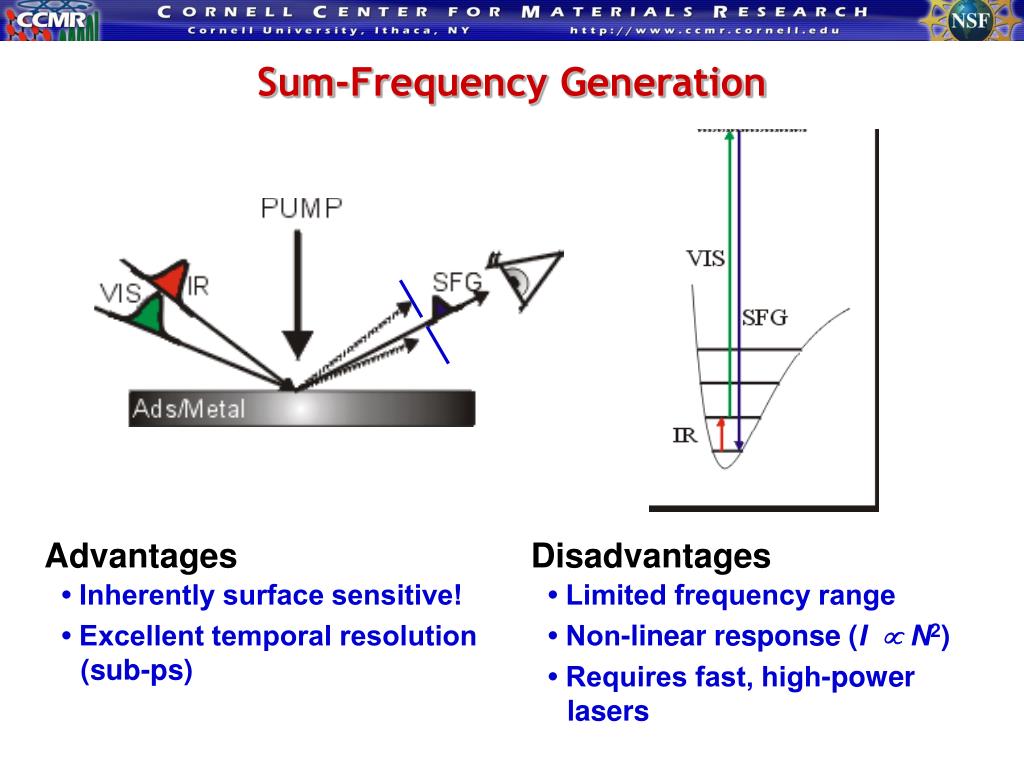 Sum-Frequency Generation Advantages Disadvantages • Inherently surface sensitive! • Excellent temporal resolution(sub-ps) • Limited frequency range • Non-linear response (I N2) • Requires fast, high-power lasers