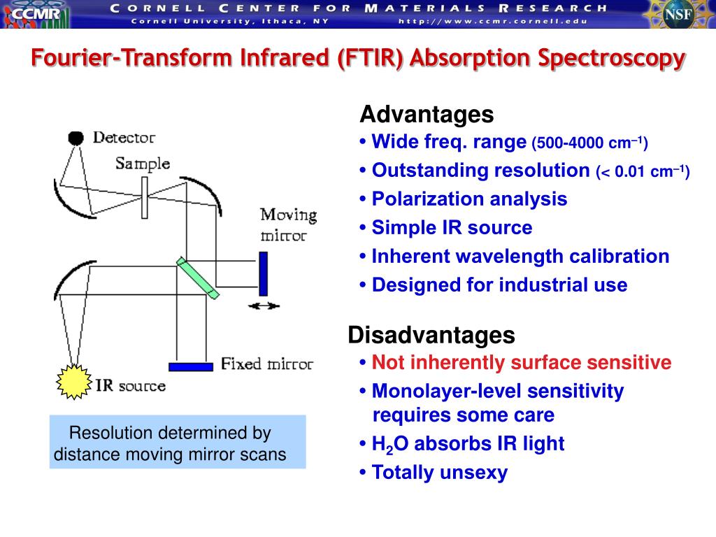 Fourier-Transform Infrared (FTIR) Absorption Spectroscopy Advantages • Wide freq. range (500-4000 cm–1) • Outstanding resolution (< 0.01 cm–1) • Polarization analysis • Simple IR source • Inherent wavelength calibration • Designed for industrial use Disadvantages • Not inherently surface sensitive • Monolayer-level sensitivity requires some care • H2O absorbs IR light • Totally unsexy Resolution determined by distance moving mirror scans