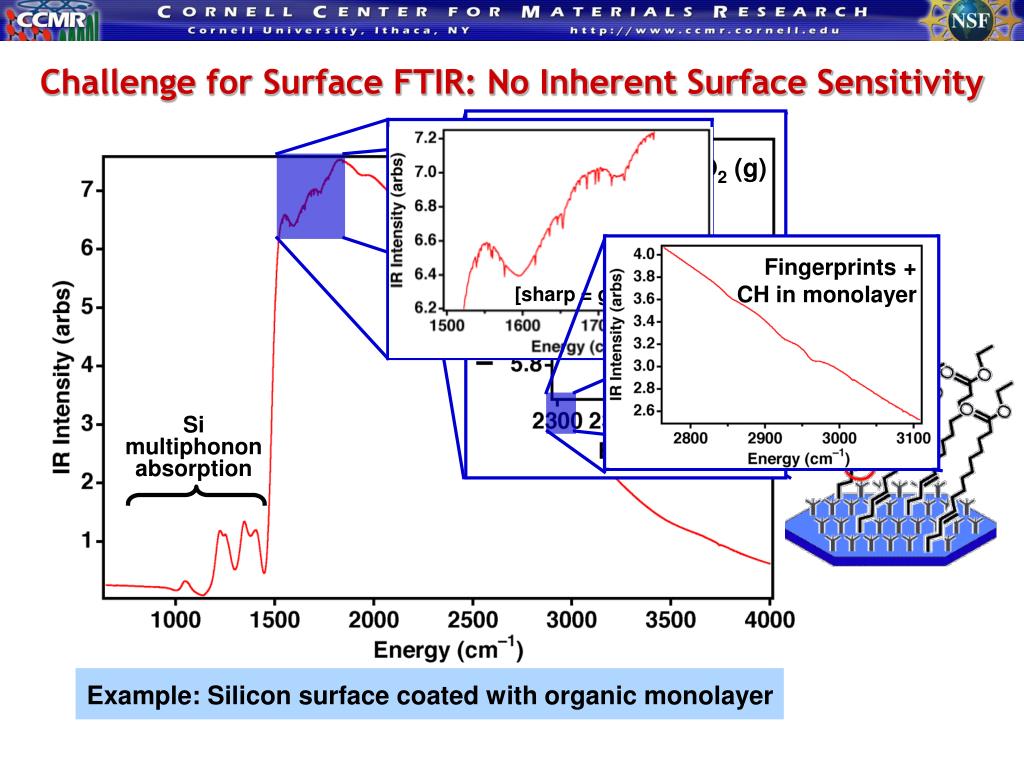 CO2 (g) Blackbodyspectrum (IR source) Fingerprints +CH in monolayer Simultiphononabsorption H2O (g) [sharp = gas phase] Example: Silicon surface coated with organic monolayer Challenge for Surface FTIR: No Inherent Surface Sensitivity