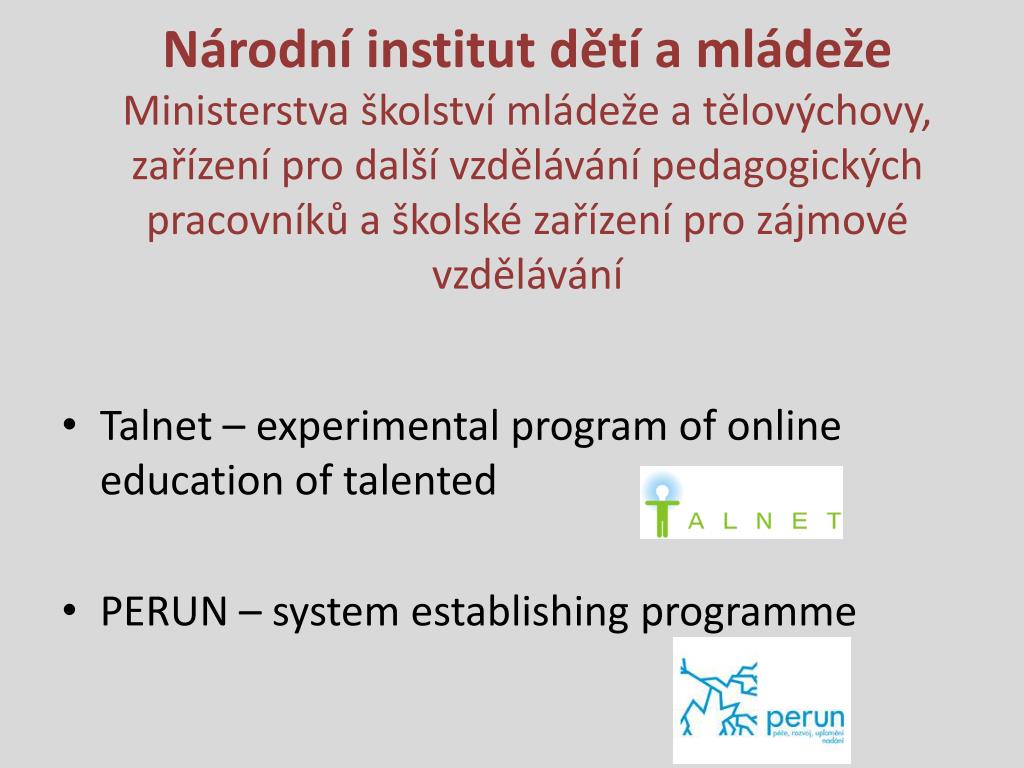 Národní institut dětí a mládeže Ministerstva školství mládeže a tělovýchovy,zařízení pro další vzdělávání pedagogických pracovníků a školské zařízení pro zájmové vzdělávání • Talnet – experimental program of online educationoftalented • PERUN – systemestablishingprogramme