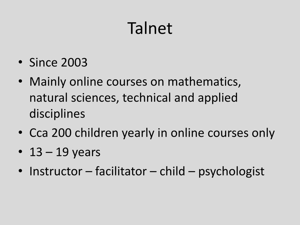 Talnet • Since 2003 • Mainly online courses on mathematics, natural sciences, technical and applied disciplines • Cca 200 children yearly in online courses only • 13 – 19 years • Instructor – facilitator – child – psychologist
