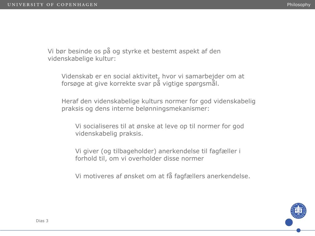 Philosophy • Vi bør besinde os på og styrke et bestemt aspekt af den videnskabelige kultur: • Videnskab er en social aktivitet, hvor vi samarbejder om at forsøge at give korrekte svar på vigtige spørgsmål. • Heraf den videnskabelige kulturs normer for god videnskabelig praksis og dens interne belønningsmekanismer: • Vi socialiseres til at ønske at leve op til normer for god videnskabelig praksis. • Vi giver (og tilbageholder) anerkendelse til fagfæller i forhold til, om vi overholder disse normer • Vi motiveres af ønsket om at få fagfællers anerkendelse.