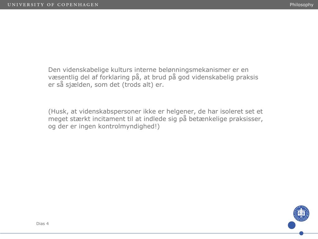 Philosophy • Den videnskabelige kulturs interne belønningsmekanismer er en væsentlig del af forklaring på, at brud på god videnskabelig praksis er så sjælden, som det (trods alt) er. • (Husk, at videnskabspersoner ikke er helgener, de har isoleret set et meget stærkt incitament til at indlede sig på betænkelige praksisser, og der er ingen kontrolmyndighed!)