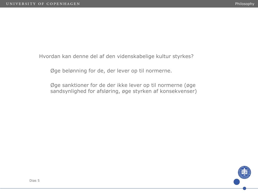 Philosophy • Hvordan kan denne del af den videnskabelige kultur styrkes? • Øge belønning for de, der lever op til normerne. • Øge sanktioner for de der ikke lever op til normerne (øge sandsynlighed for afsløring, øge styrken af konsekvenser)