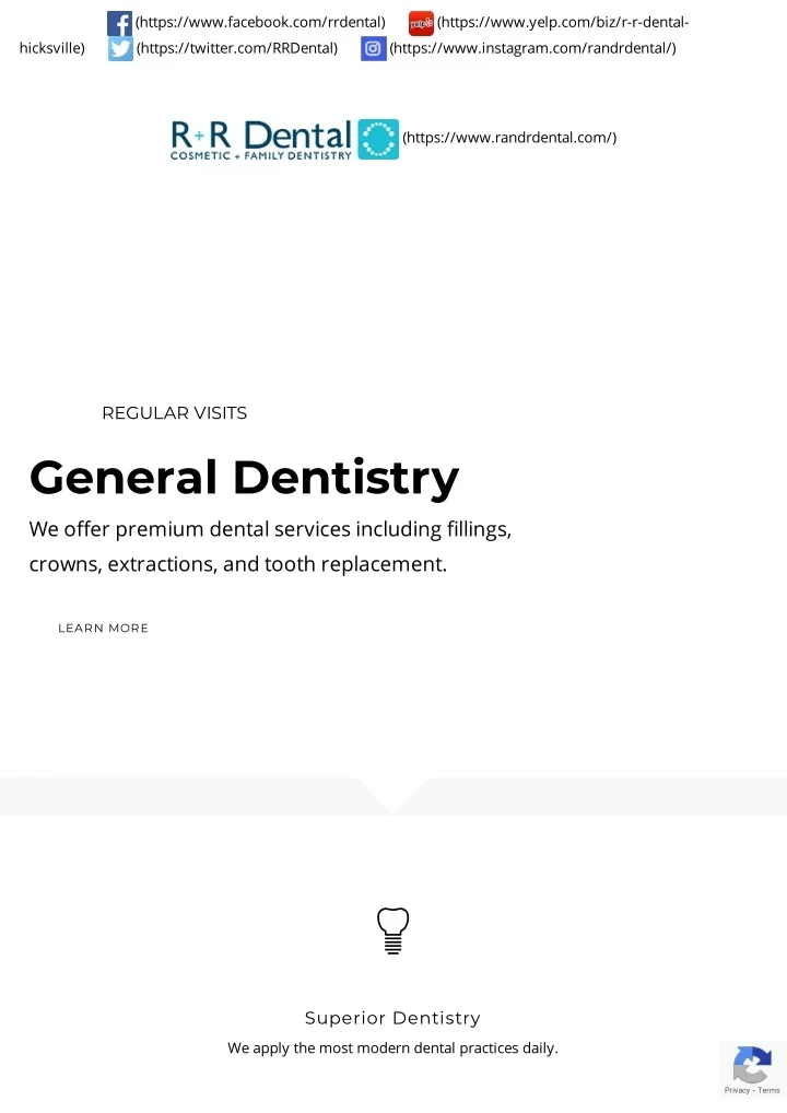 (https://www.facebook.com/rrdental) (https://twitter.com/RRDental) (https://www.yelp.com/biz/r-r-dental- (https://www.instagram.com/randrdental/) hicksville) (https://www.randrdental.com/) REGULAR VISITS General Dentistry We o?er premium dental services including ?llings, crowns, extractions, and tooth replacement. LEARN MORE Superior Dentistry We apply the most modern dental practices daily. Privacy - Terms