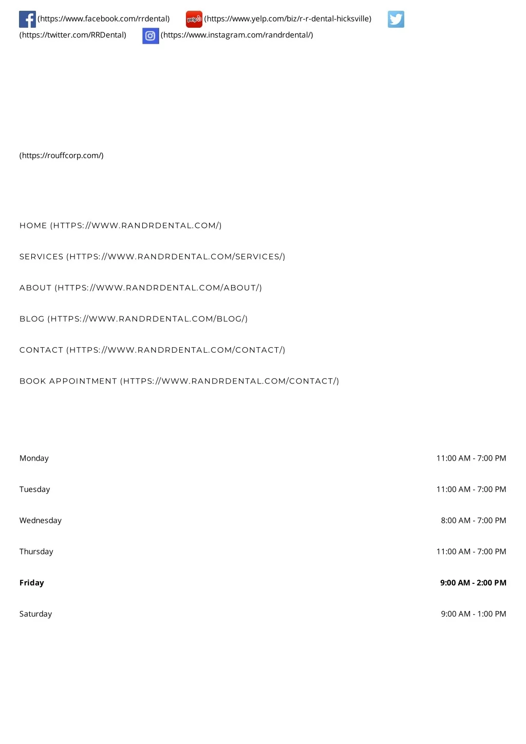 (https://www.facebook.com/rrdental) (https://www.yelp.com/biz/r-r-dental-hicksville) (https://twitter.com/RRDental) (https://www.instagram.com/randrdental/) Website By: (https://rou?corp.com/) Navigation HOME (HTTPS: //WWW.RANDRDENTAL.COM/) SERVICES (HTTPS: //WWW.RANDRDENTAL.COM/SERVICES/) ABOUT (HTTPS: //WWW.RANDRDENTAL.COM/ABOUT/) BLOG (HTTPS: //WWW.RANDRDENTAL.COM/BLOG/) CONTACT (HTTPS: //WWW.RANDRDENTAL.COM/CONTACT/) BOOK APPOINTMENT (HTTPS: //WWW.RANDRDENTAL.COM/CONTACT/) Opening Hours Monday 11:00 AM - 7:00 PM Tuesday 11:00 AM - 7:00 PM Wednesday 8:00 AM - 7:00 PM Thursday 11:00 AM - 7:00 PM Friday 9:00 AM - 2:00 PM Saturday 9:00 AM - 1:00 PM Contact