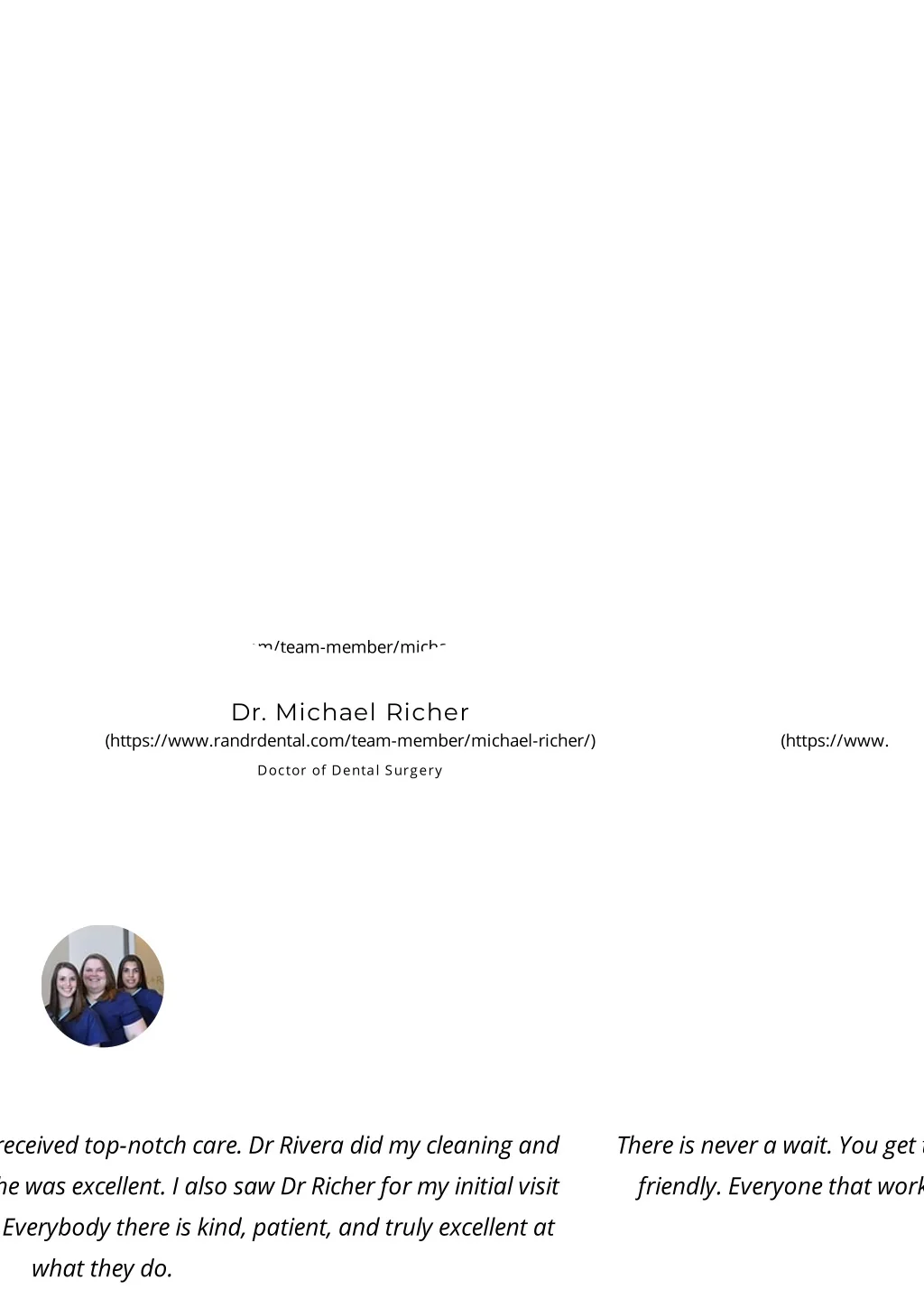 (https://www.randrdental.com/team-member/michael-richer/) (https://www.randrdenta Dr. Michael Richer (https://www.randrdental.com/team-member/michael-richer/) (https://www. Doctor of Dental Surgery HE STAFF IS GREAT received top-notch care. Dr Rivera did my cleaning and he was excellent. I also saw Dr Richer for my initial visit Everybody there is kind, patient, and truly excellent at what they do. There is never a wait. You get t friendly. Everyone that work