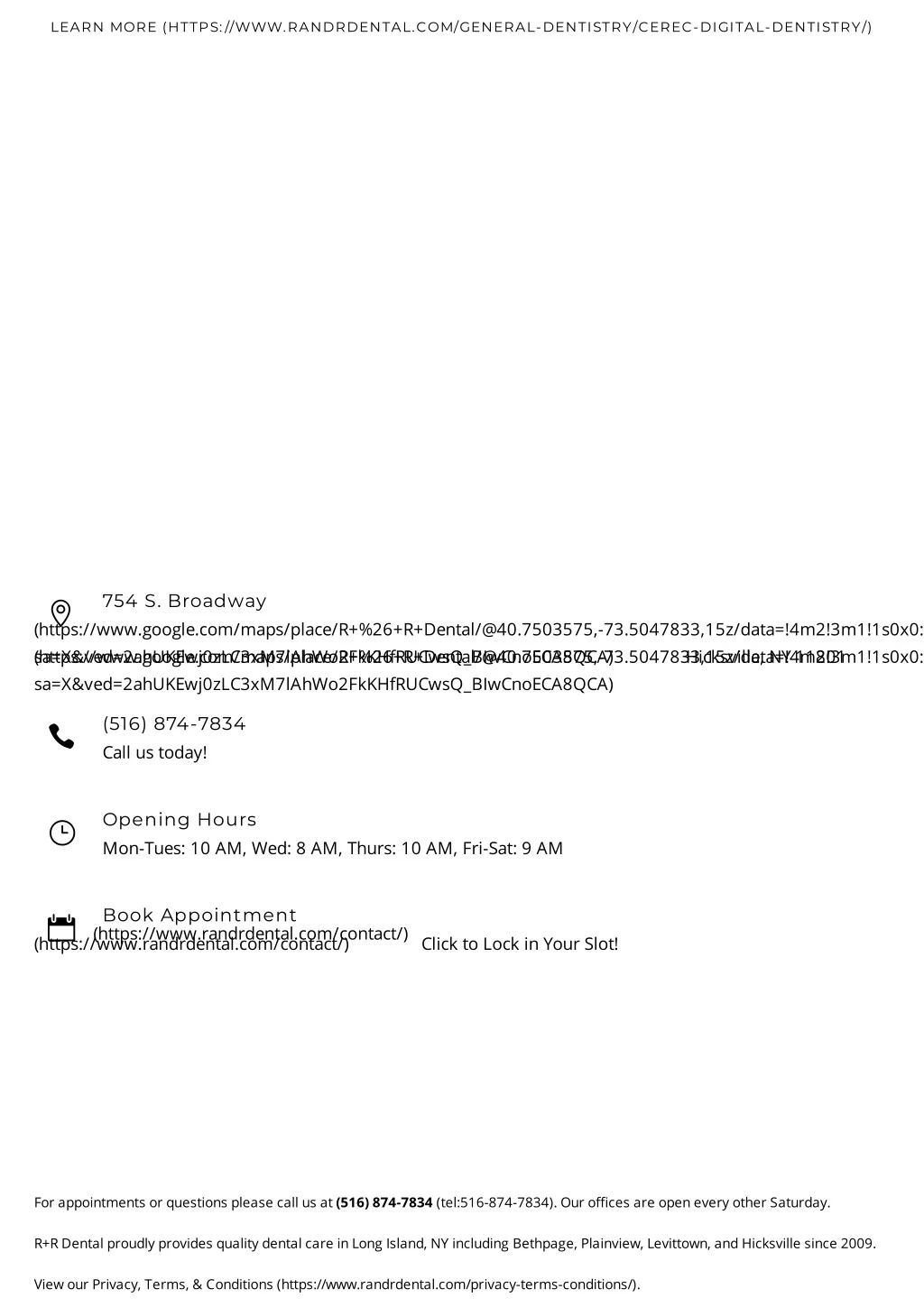 LEARN MORE (HTTPS: //WWW.RANDRDENTAL.COM/GENERAL-DENTISTRY/CEREC-DIGITAL-DENTISTRY/) 754 S. Broadway (https://www.google.com/maps/place/R+%26+R+Dental/@40.7503575,-73.5047833,15z/data=!4m2!3m1!1s0x0: sa=X&ved=2ahUKEwj0zLC3xM7lAhWo2FkKHfRUCwsQ_BIwCnoECA8QCA) (https://www.google.com/maps/place/R+%26+R+Dental/@40.7503575,-73.5047833,15z/data=!4m2!3m1!1s0x0: sa=X&ved=2ahUKEwj0zLC3xM7lAhWo2FkKHfRUCwsQ_BIwCnoECA8QCA) Hicksville, NY 11801 (516) 874-7834 Call us today! Opening Hours Mon-Tues: 10 AM, Wed: 8 AM, Thurs: 10 AM, Fri-Sat: 9 AM } Book Appointment (https://www.randrdental.com/contact/) (https://www.randrdental.com/contact/) Click to Lock in Your Slot! For appointments or questions please call us at (516) 874-7834 (tel:516-874-7834). Our o?ces are open every other Saturday. R+R Dental proudly provides quality dental care in Long Island, NY including Bethpage, Plainview, Levittown, and Hicksville since 2009. View our Privacy, Terms, & Conditions (https://www.randrdental.com/privacy-terms-conditions/).