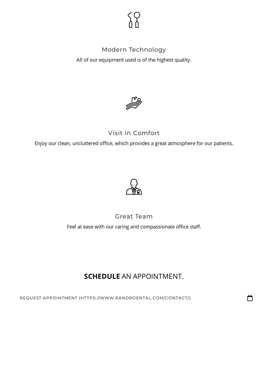 Modern Technology All of our equipment used is of the highest quality. Visit in Comfort Enjoy our clean, uncluttered o?ce, which provides a great atmosphere for our patients. Great Team Feel at ease with our caring and compassionate o?ce sta?. SCHEDULE AN APPOINTMENT. REQUEST APPOINTMENT (HTTPS: //WWW.RANDRDENTAL.COM/CONTACT/)