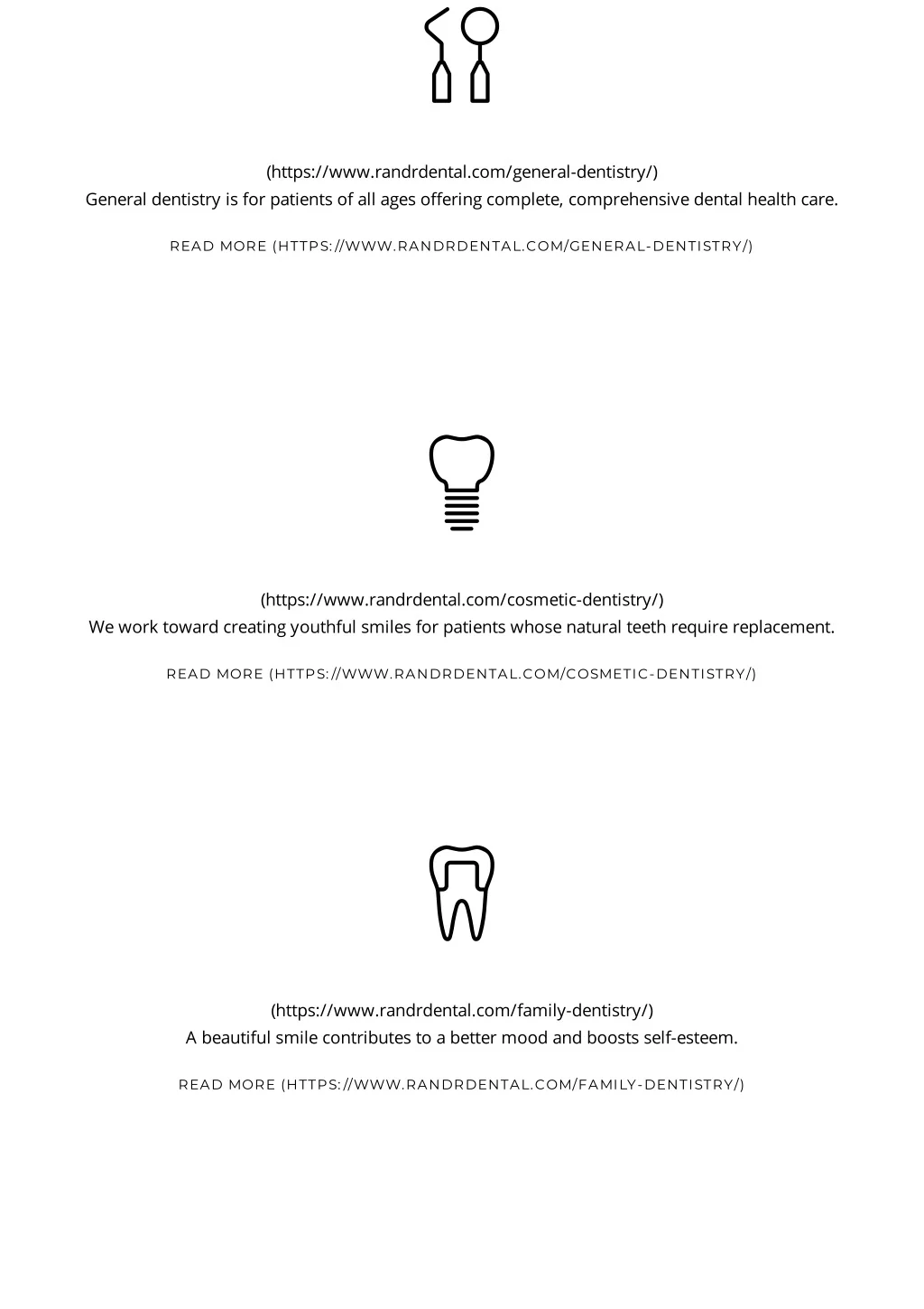 General Dentistry (https://www.randrdental.com/general-dentistry/) General dentistry is for patients of all ages o?ering complete, comprehensive dental health care. READ MORE (HTTPS: //WWW.RANDRDENTAL.COM/GENERAL-DENTISTRY/) Cosmetic Dentistry (https://www.randrdental.com/cosmetic-dentistry/) We work toward creating youthful smiles for patients whose natural teeth require replacement. READ MORE (HTTPS: //WWW.RANDRDENTAL.COM/COSMETIC-DENTISTRY/) Family Dentistry (https://www.randrdental.com/family-dentistry/) A beautiful smile contributes to a better mood and boosts self-esteem. READ MORE (HTTPS: //WWW.RANDRDENTAL.COM/FAMILY-DENTISTRY/)