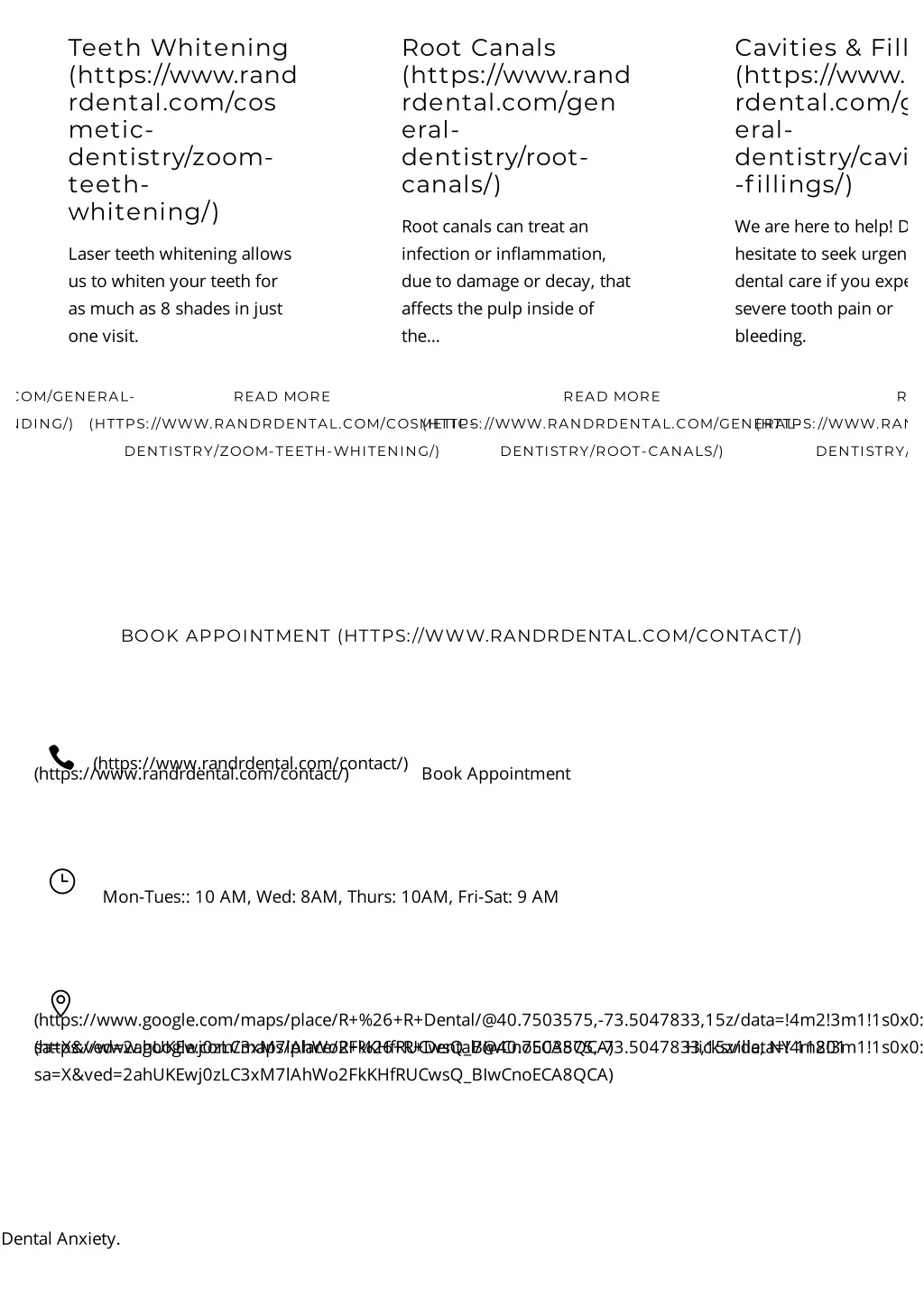 Teeth Whitening (https://www.rand rdental.com/cos metic- dentistry/zoom- teeth- whitening/) Root Canals (https://www.rand rdental.com/gen eral- dentistry/root- canals/) Cavities & Fill (https://www. rdental.com/g eral- dentistry/cavi -fillings/) Root canals can treat an infection or in?ammation, due to damage or decay, that a?ects the pulp inside of the... We are here to help! D hesitate to seek urgen dental care if you expe severe tooth pain or bleeding. Laser teeth whitening allows us to whiten your teeth for as much as 8 shades in just one visit. COM/GENERAL- READ MORE READ MORE R NDING/) (HTTPS: //WWW.RANDRDENTAL.COM/COSMETIC- (HTTPS: //WWW.RANDRDENTAL.COM/GENERAL- (HTTPS: //WWW.RAN DENTISTRY/ZOOM-TEETH-WHITENING/) DENTISTRY/ROOT-CANALS/) DENTISTRY/ BOOK APPOINTMENT (HTTPS://WWW.RANDRDENTAL.COM/CONTACT/) (516) 874-7834 (https://www.randrdental.com/contact/) (https://www.randrdental.com/contact/) Book Appointment Opening Hours Mon-Tues:: 10 AM, Wed: 8AM, Thurs: 10AM, Fri-Sat: 9 AM } 754 S Broadway (https://www.google.com/maps/place/R+%26+R+Dental/@40.7503575,-73.5047833,15z/data=!4m2!3m1!1s0x0: sa=X&ved=2ahUKEwj0zLC3xM7lAhWo2FkKHfRUCwsQ_BIwCnoECA8QCA) (https://www.google.com/maps/place/R+%26+R+Dental/@40.7503575,-73.5047833,15z/data=!4m2!3m1!1s0x0: sa=X&ved=2ahUKEwj0zLC3xM7lAhWo2FkKHfRUCwsQ_BIwCnoECA8QCA) Hicksville, NY 11801 Dental Anxiety.