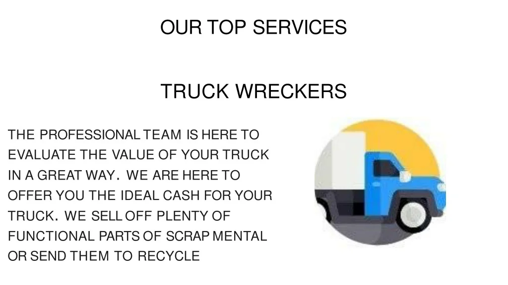 OUR TOPSERVICES TRUCKWRECKERS THE PROFESSIONAL TEAM IS HERE TO EVALUATE THE VALUE OF YOUR TRUCK IN A GREAT WAY. WE ARE HERE TO OFFER YOU THE IDEAL CASH FOR YOUR TRUCK. WE SELL OFF PLENTY OF FUNCTIONAL PARTS OF SCRAP MENTAL OR SEND THEM TORECYCLE