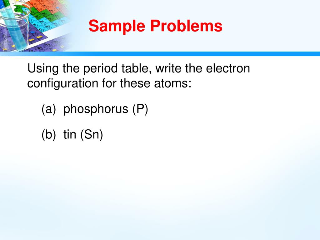 Sample Problems Using the period table, write the electron configuration for these atoms: • phosphorus (P) (b) tin (Sn)