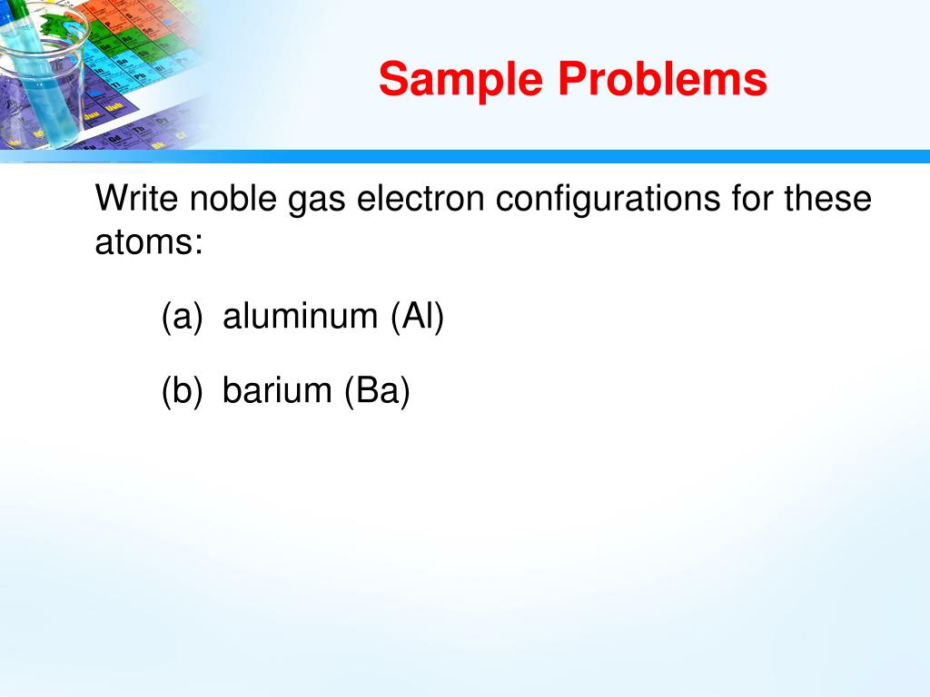 Sample Problems Write noble gas electron configurations for these atoms: • aluminum (Al) • barium (Ba)