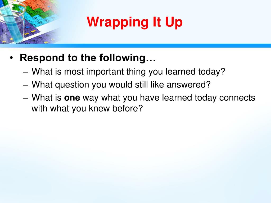 Wrapping It Up • Respond to the following… • What is most important thing you learned today? • What question you would still like answered? • What is one way what you have learned today connects with what you knew before?