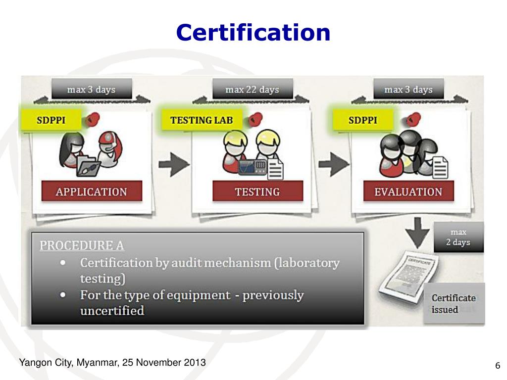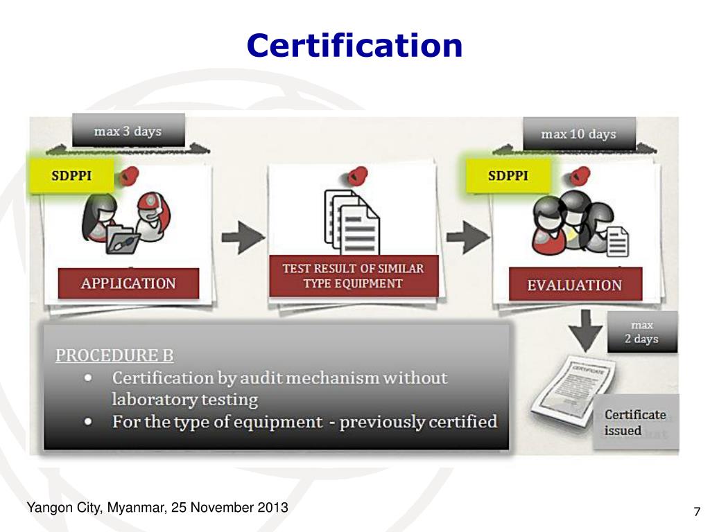 Conformity Assessment • Certification of telecommunication equipment is conducted based on Ministerial Regulation No 29/2008 • Post market surveillance is conducted based on Ministerial Regulation No 08/ 2012 concerning Procedure for Post Market Surveillance Implementation