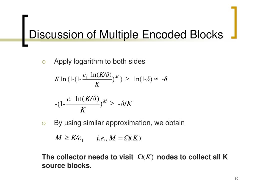 Discussion of Multiple Encoded Blocks • Apply logarithm to both sides • By using similar approximation, we obtain The collector needs to visit nodes to collect all K source blocks.