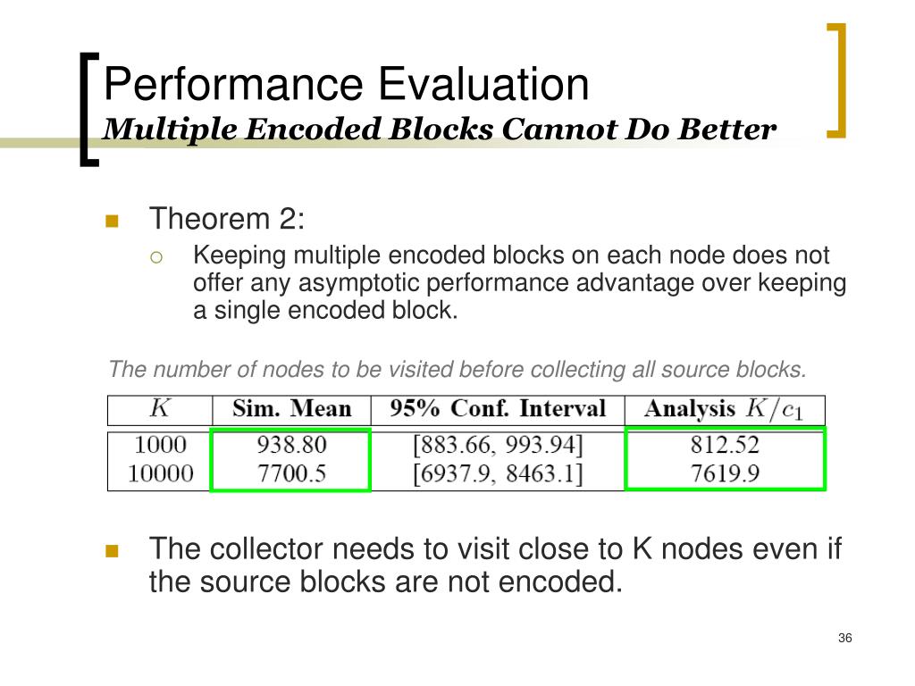 Performance EvaluationMultiple Encoded Blocks Cannot Do Better • Theorem 2: • Keeping multiple encoded blocks on each node does not offer any asymptotic performance advantage over keeping a single encoded block. • The collector needs to visit close to K nodes even if the source blocks are not encoded. The number of nodes to be visited before collecting all source blocks.