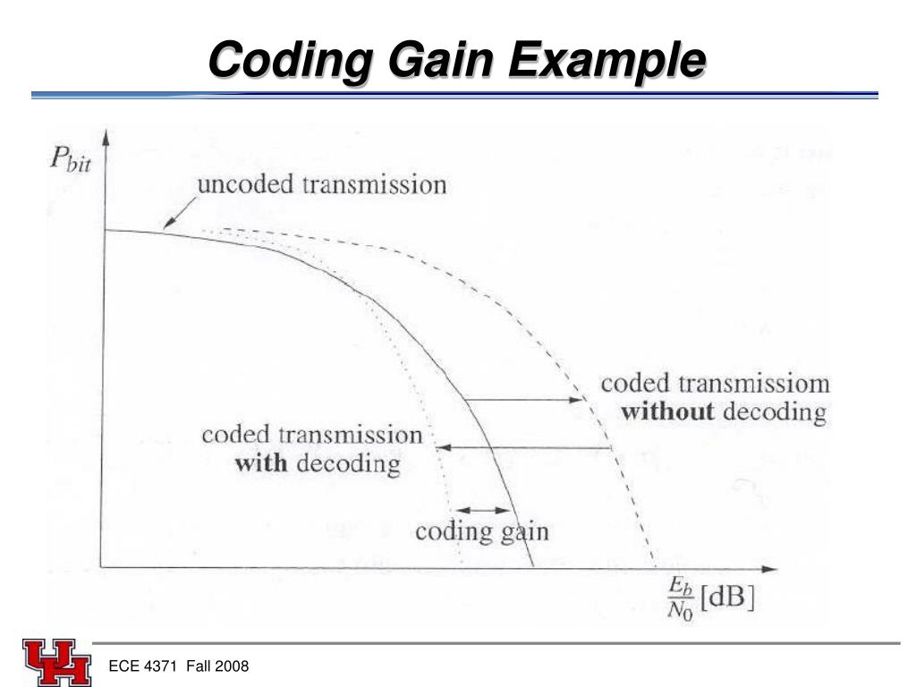 Coding Gain • Coding Rate R=k/n, k, no. of message symbol, n overall symbol • Word SNR and bit SNR • For a coding scheme, the coding gain at a given bit error probability is defined as the difference between the energy per information bit required by the coding scheme to achieve the given bit error probability and that by uncoded transmission.