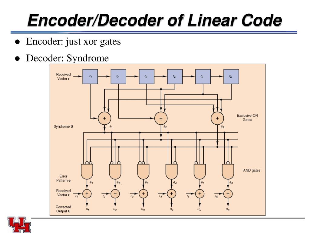 Encoder/Decoder of Linear Code • Encoder: just xor gates • Decoder: Syndrome