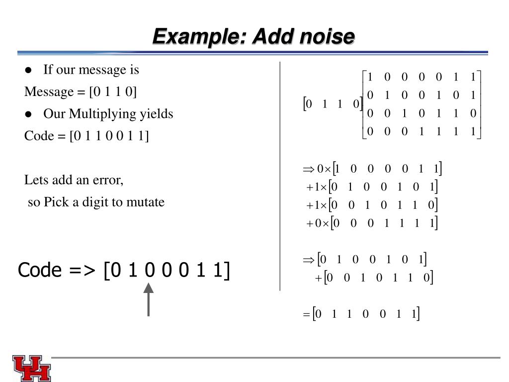 Example: Add noise • If our message is Message = [0 1 1 0] • Our Multiplying yields Code = [0 1 1 0 0 1 1] Lets add an error, so Pick a digit to mutate Code => [0 1 0 0 0 1 1]