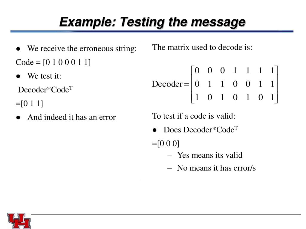 Example: Testing the message The matrix used to decode is: To test if a code is valid: • Does Decoder*CodeT =[0 0 0] • Yes means its valid • No means it has error/s • We receive the erroneous string: Code = [0 1 0 0 0 1 1] • We test it: Decoder*CodeT =[0 1 1] • And indeed it has an error