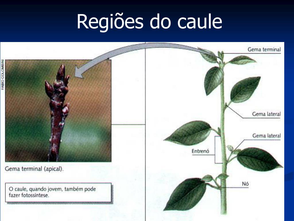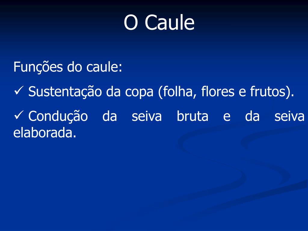 O Caule • Funções do caule: • Sustentação da copa (folha, flores e frutos). • Condução da seiva bruta e da seiva elaborada.