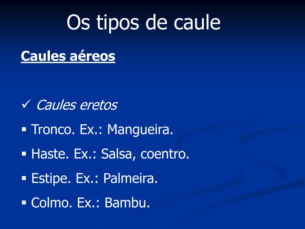 Os tipos de caule Caules aéreos • Caules eretos • Tronco. Ex.: Mangueira. • Haste. Ex.: Salsa, coentro. • Estipe. Ex.: Palmeira. • Colmo. Ex.: Bambu.