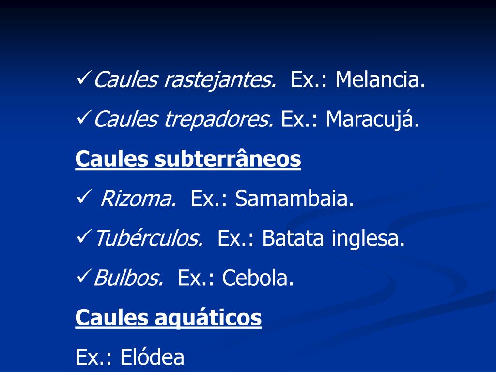 Caules rastejantes. Ex.: Melancia. • Caules trepadores. Ex.: Maracujá. Caules subterrâneos • Rizoma. Ex.: Samambaia. • Tubérculos. Ex.: Batata inglesa. • Bulbos. Ex.: Cebola. Caules aquáticos Ex.: Elódea