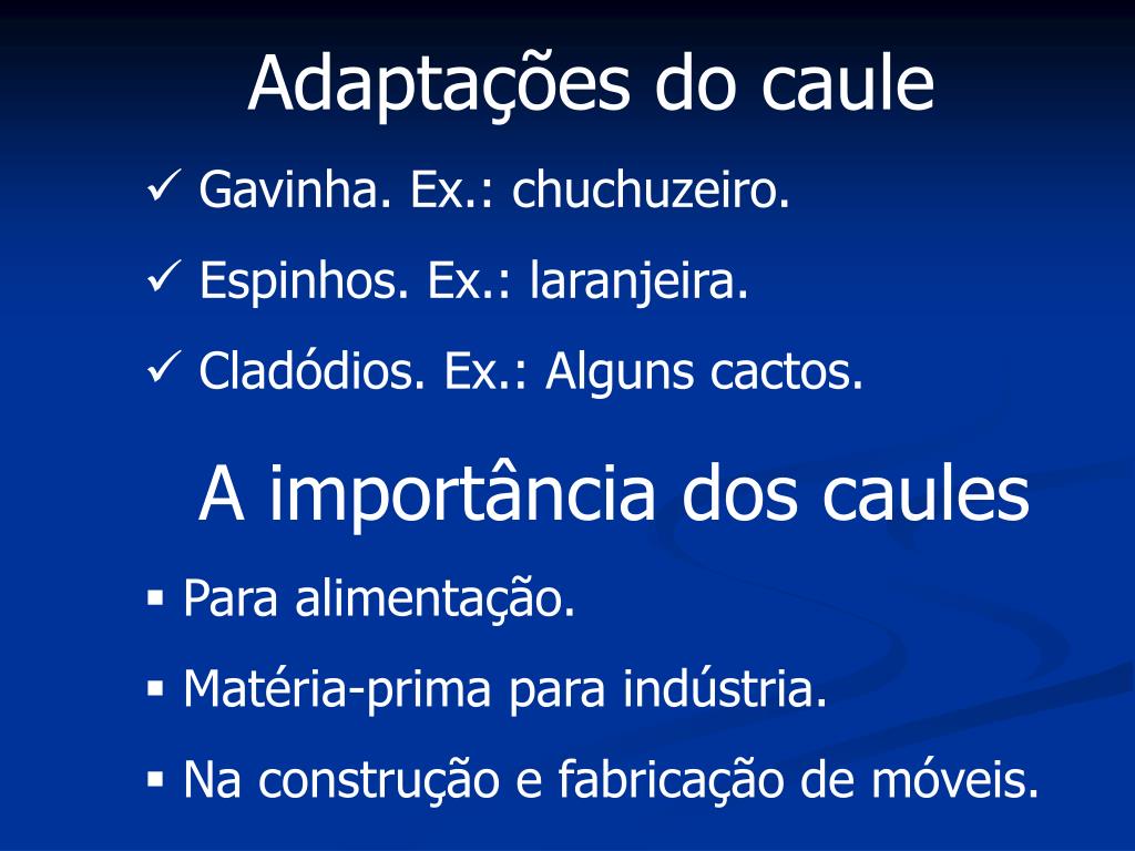 Adaptações do caule • Gavinha. Ex.: chuchuzeiro. • Espinhos. Ex.: laranjeira. • Cladódios. Ex.: Alguns cactos. • A importância dos caules • Para alimentação. • Matéria-prima para indústria. • Na construção e fabricação de móveis.