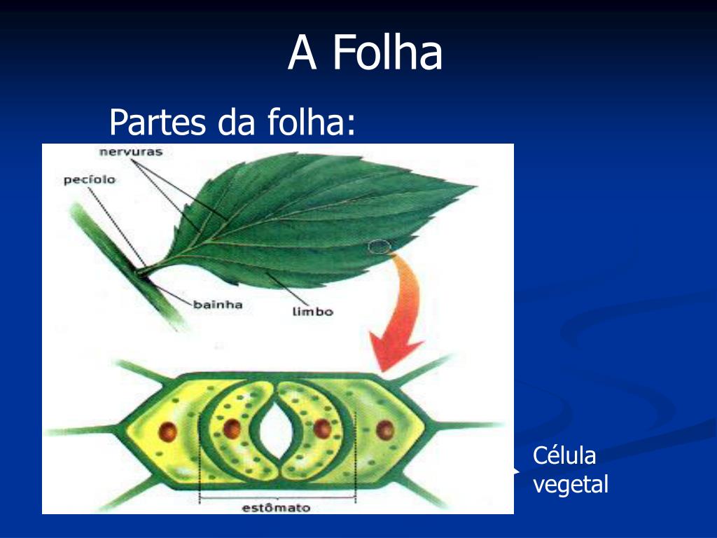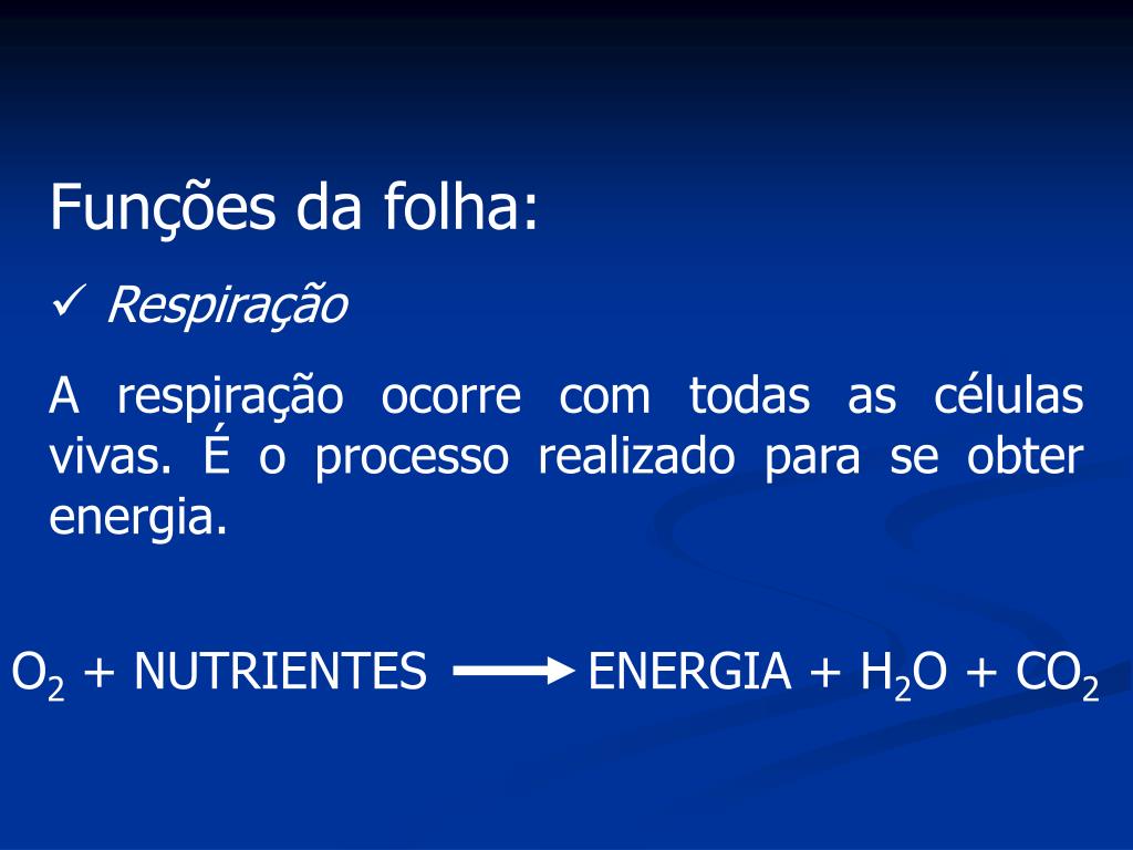 Funções da folha: • Respiração A respiração ocorre com todas as células vivas. É o processo realizado para se obter energia. O2 + NUTRIENTES ENERGIA + H2O + CO2
