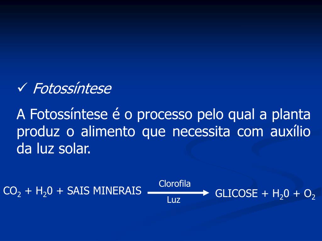 Fotossíntese A Fotossíntese é o processo pelo qual a planta produz o alimento que necessita com auxílio da luz solar. Clorofila CO2 + H20 + SAIS MINERAIS GLICOSE + H20 + O2 Luz