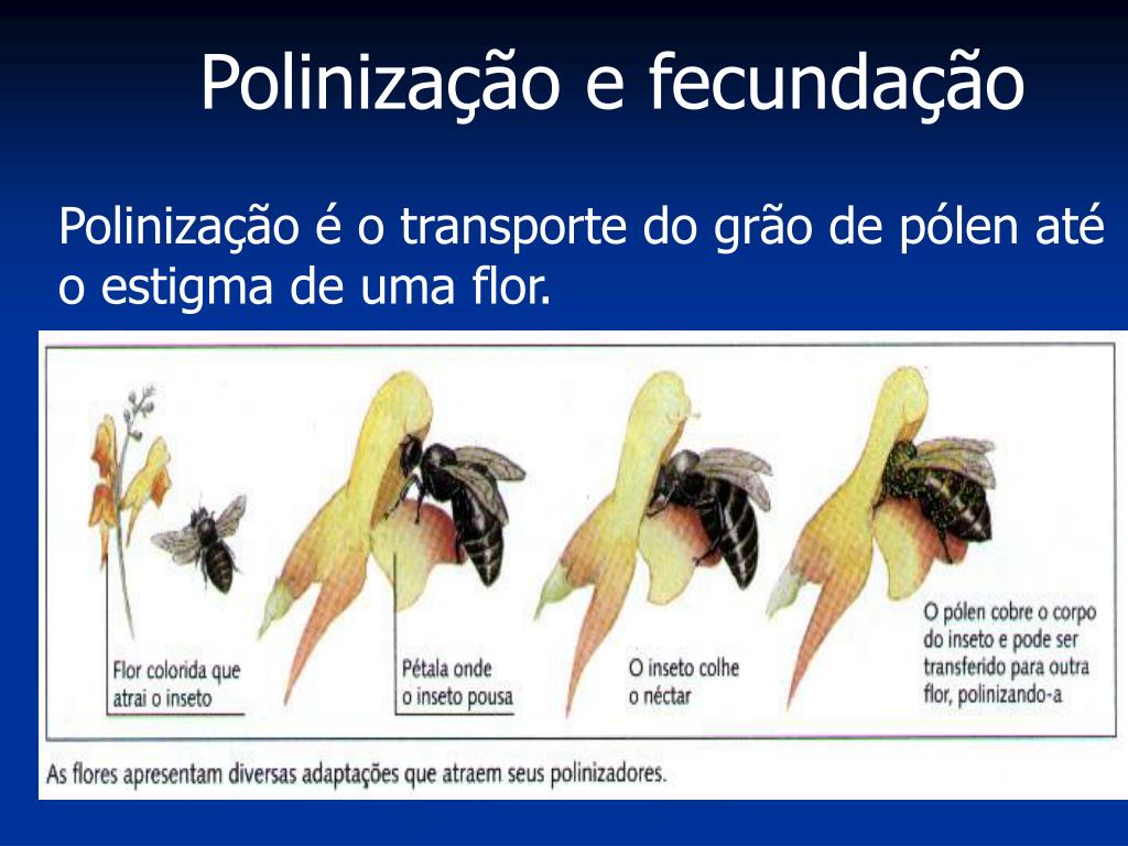 Polinização e fecundação Polinização é o transporte do grão de pólen até o estigma de uma flor.