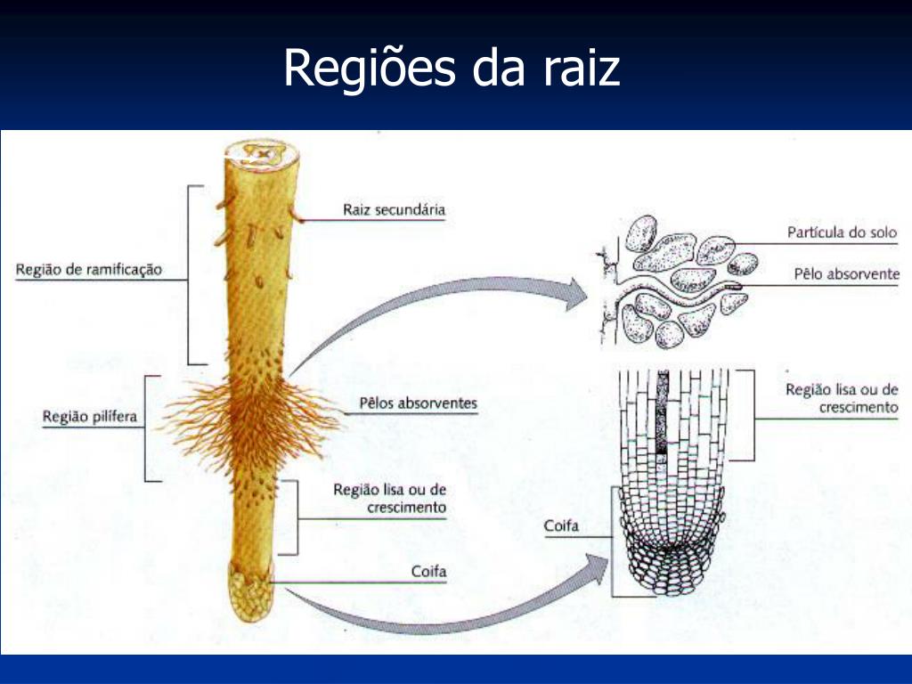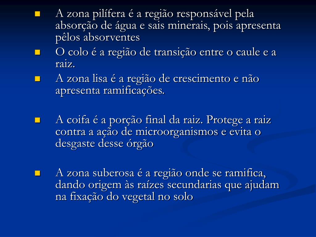 A zona pilífera é a região responsável pela absorção de água e sais minerais, pois apresenta pêlos absorventes O colo é a região de transição entre o caule e a raiz. A zona lisa é a região de crescimento e não apresenta ramificações. A coifa é a porção final da raiz. Protege a raiz contra a ação de microorganismos e evita o desgaste desse órgão A zona suberosa é a região onde se ramifica, dando origem às raízes secundarias que ajudam na fixação do vegetal no solo