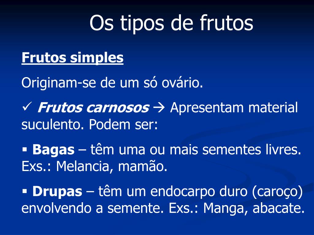 Os tipos de frutos Frutos simples Originam-se de um só ovário. • Frutos carnosos Apresentam material suculento. Podem ser: • Bagas – têm uma ou mais sementes livres. Exs.: Melancia, mamão. • Drupas – têm um endocarpo duro (caroço) envolvendo a semente. Exs.: Manga, abacate.