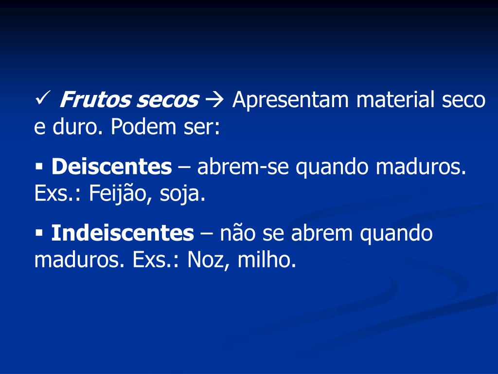 Frutos secos Apresentam material seco e duro. Podem ser: • Deiscentes – abrem-se quando maduros. Exs.: Feijão, soja. • Indeiscentes – não se abrem quando maduros. Exs.: Noz, milho.