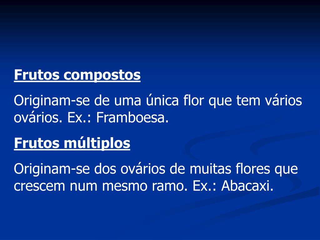 Frutos compostos Originam-se de uma única flor que tem vários ovários. Ex.: Framboesa. Frutos múltiplos Originam-se dos ovários de muitas flores que crescem num mesmo ramo. Ex.: Abacaxi.