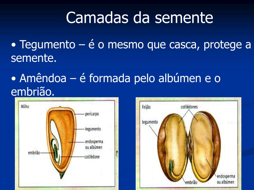 Camadas da semente • Tegumento – é o mesmo que casca, protege a semente. • Amêndoa – é formada pelo albúmen e o embrião.